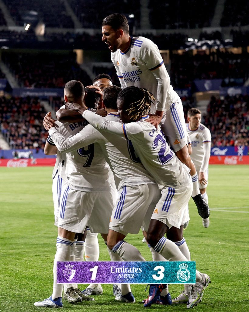 ورفع ريال مدريد رصيده إلى 78 نقطة في الصدارة بفارق 17 نقطة أمام أقرب منافسيه أتلتيكو مدريد صاحب المركز الثاني، والذي تعادل الأربعاء على ملعبه مع غرناطة سلبيا، بينما تجمد رصيد أوساسونا عند 44 نقطة في المركز التاسع.