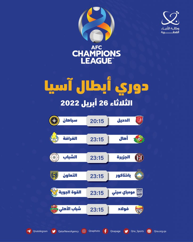 يشهد دوري أبطال آسيا الليلة ضمن منافسات غرب آسيا من خلال الجولة السادسة والأخيرة المباريات التالية: