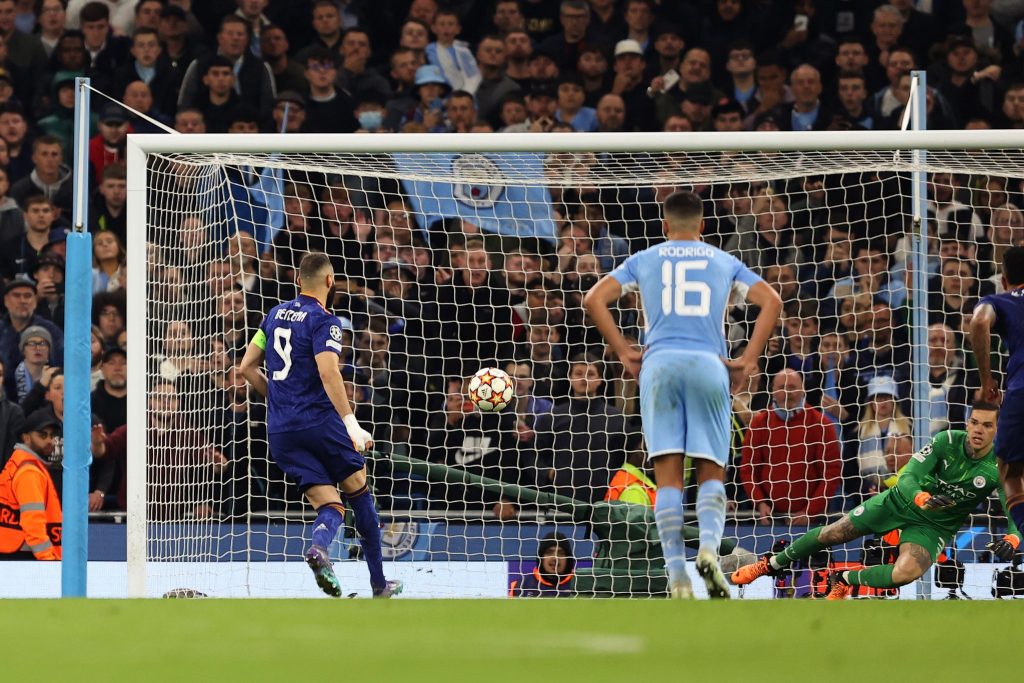 وقلص ريال مدريد الفارق في الدقيقة 33 عبر نجمه الفرنسي كريم بنزيما الذي استغل تباطوء مدافعي سيتي في إبعاد الكرة.