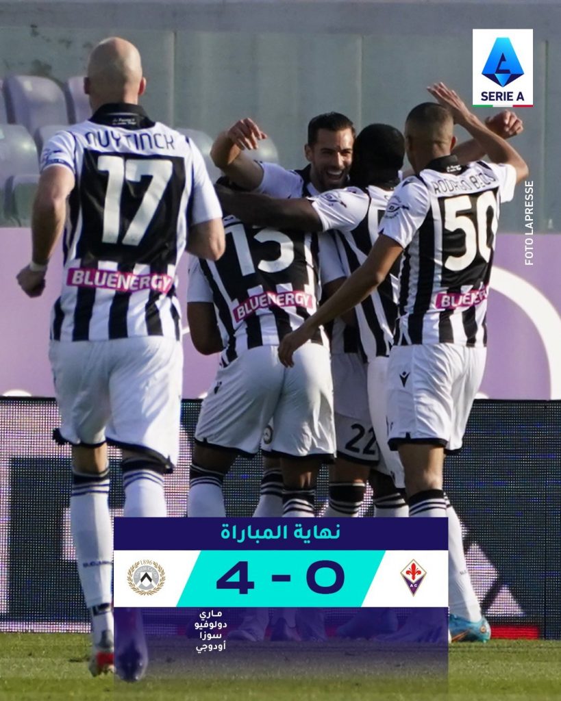 حقق فريق أودينيزي فوزا كبيرا خارج ملعبه وتغلب على مضيفه فيورنتينا 4 / صفر، اليوم الأربعاء في مباراة مؤجلة من المرحلة العشرين من الدوري الإيطالي لكرة القدم.