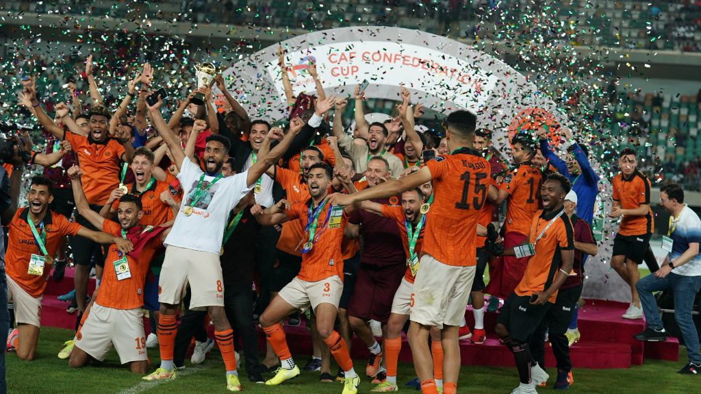 رؤية سبورت: توج فريق نهضة بركان المغربي بلقب بطولة كأس الاتحاد الإفريقي لكرة القدم ” الكونفدرالية ” بعد فوزه في المباراة النهائية على منافسه فريق أورلاندو بايرتس الجنوب إفريقي في المباراة النهائية التي إنتهت فجر السبت في نيجيريا، على ملعب “جودسويل أكبابيو” وأنتهى الوقتين الأصلي والإضافي بالتعادل 1/1 ، وابتسمت ركلات الترجيح لنهضة بركان ليفوز ويحسم النتيجة 4/5 ، ويفوز باللقب الإفريقي للمرة الثانية في ظل سيطرة مغربية على هذه الكأس الأفريقية ، حيث فازت بها الأندية المغربية للمرة الثالثة على التوالي، وكان فريق نهضة بركان قد فاز بالكونفدرالية للمرة الأولى في العام 2020.
