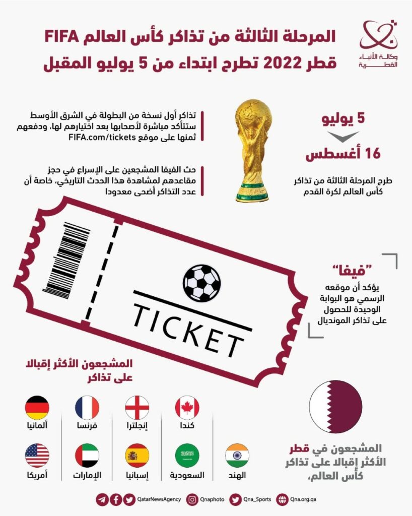ويمكنكم الاطلاع في قسم الأسئلة الشائعة في موقع FIFA.com/tickets على مزيد من المعلومات حول التذاكر وباقاتها وفئاتها وأسعارها، كما يمكنكم زيارة موقع Qatar2022.qa لحجز أماكن إقاماتكم والتقدم بطلب الحصول على بطاقة هيّا.