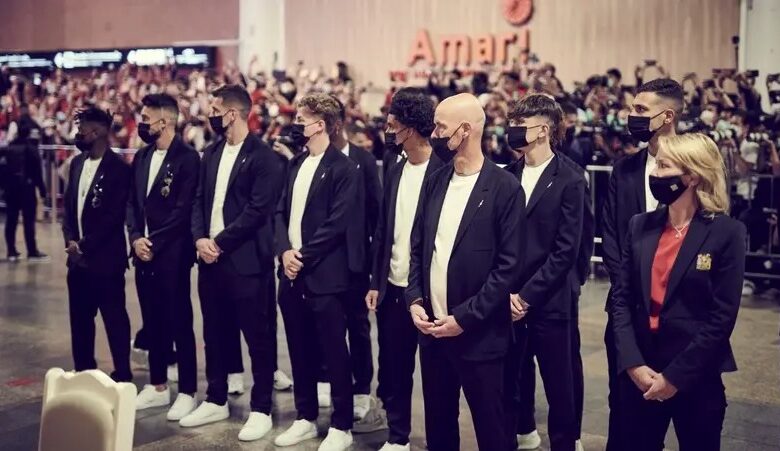 استقبل مئات من مشجعي مانشستر يونايتد الفريق الإنجليزي لدى وصوله إلى أحد مطارات بانكوك اليوم السبت لخوض مباراة ودية في مواجهة مواطنه ومنافسه في الدوري الإنجليزي الممتاز لكرة القدم ليفربول في وقت لاحق من الأسبوع الجاري.