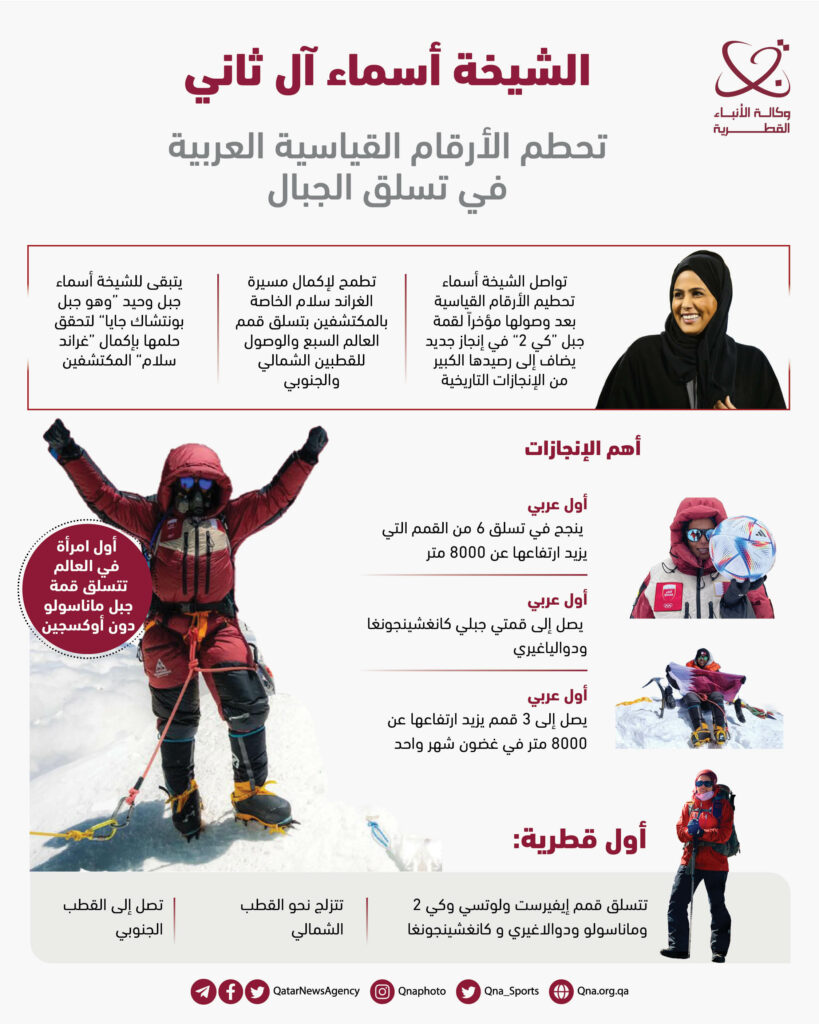حققت الشيخة أسماء آل ثاني انجازا رياضيا قطريا جديدا ، بوصولها لقمة ثاني أعلى قمة جبل في العالم، بارتفاع 8610م محققة بذلك أول اول انجاز رياضي عربي، بالوصول إلى 6 قمم فوق إرتفاع 8000م .