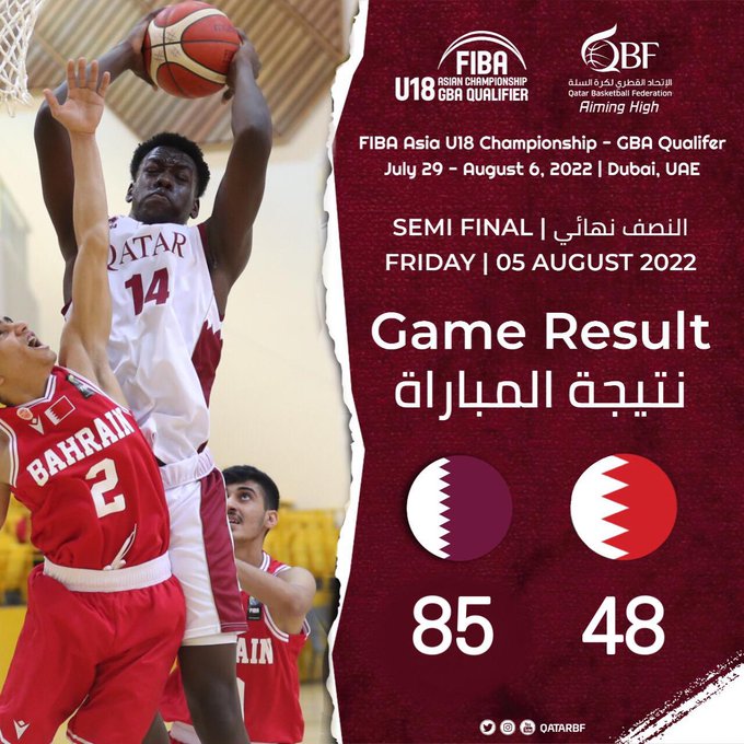 دبي: تأهل منتخب قطر لكرة السلة تحت 18 عاما إلى نهائي البطولة الخليجية، بعد ان حقق المنتخب القطري فوزا كبيرا أمام نظيره البحريني 48/85 اليوم الجمعة، في الدور نصف النهائي من البطولة، التي تستضيفها دولة الإمارات وتختتم غد السبت، والمؤهلة إلى نهائيات كأس الأمم الآسيوية حيث بفوزه اليوم فقد تأهل العنابي إلى نهائيات كأس آسيا.