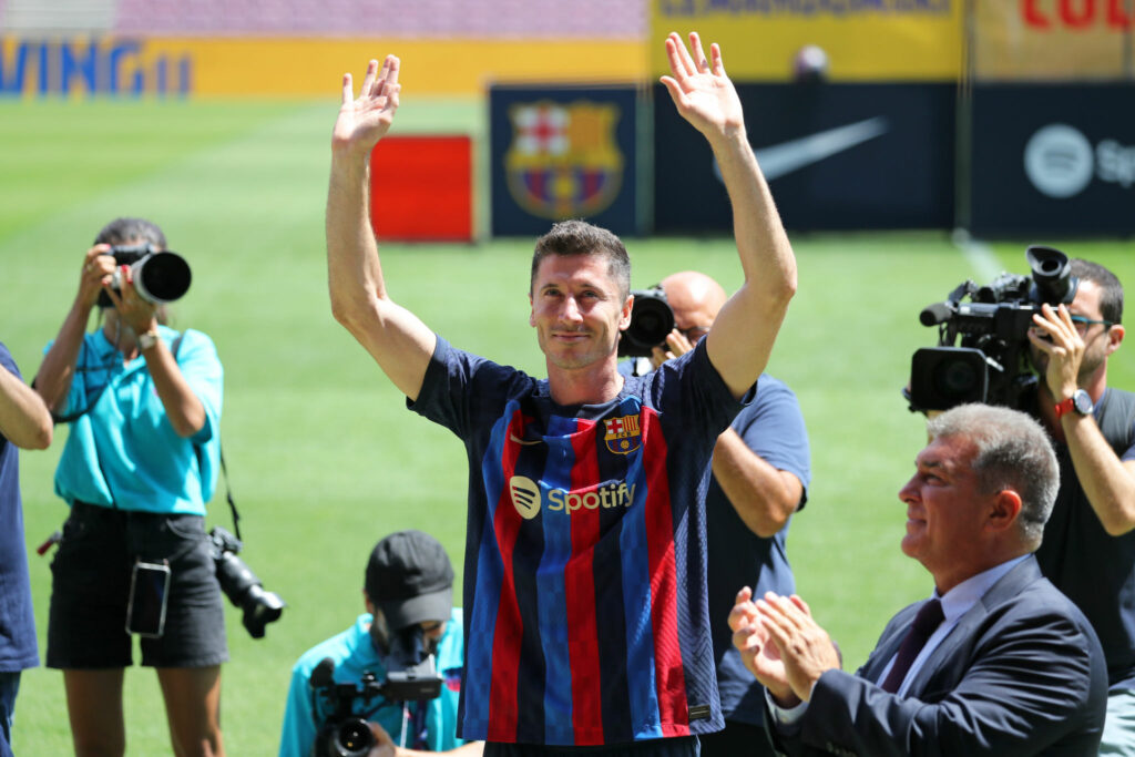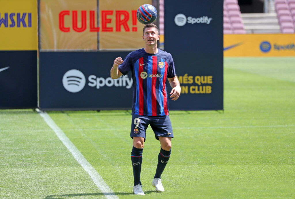 وظهر ليفاندوفسكي أثناء تقديمه لجماهير برشلونة بالرقم 9 الذي كان بحوزة الهولندي ممفيس ديباي، علما أن المهاجم البولندي ارتبط بعقد مع برشلونة مدته ثلاثة أعوام قادما من بايرن ميونيخ الألماني.