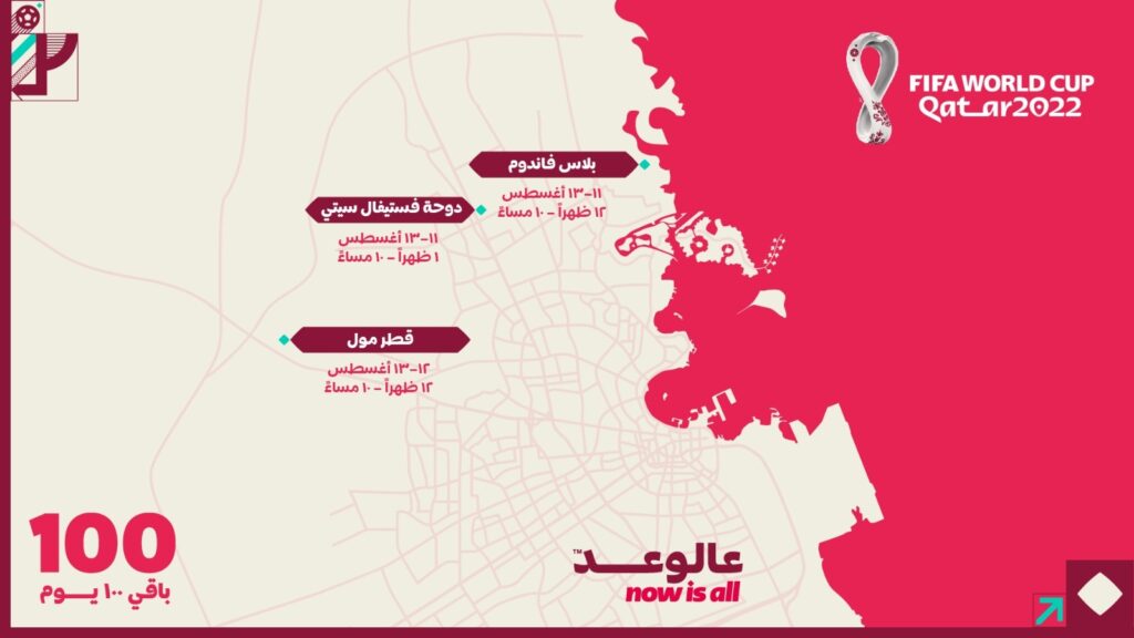 وأضاف: “ستسهم الأنشطة والفعاليات التي ننظمها احتفالاً ببقاء 100 يوم على انطلاق المونديال في تقديم لمحة عن الأجواء الرائعة التي ستعم البلاد خلال المهرجان الكروي، مع اقترابنا أكثر من استضافة نسخة تاريخية من البطولة، التي تقام للمرة الأولى في العالم العربي والمنطقة.”