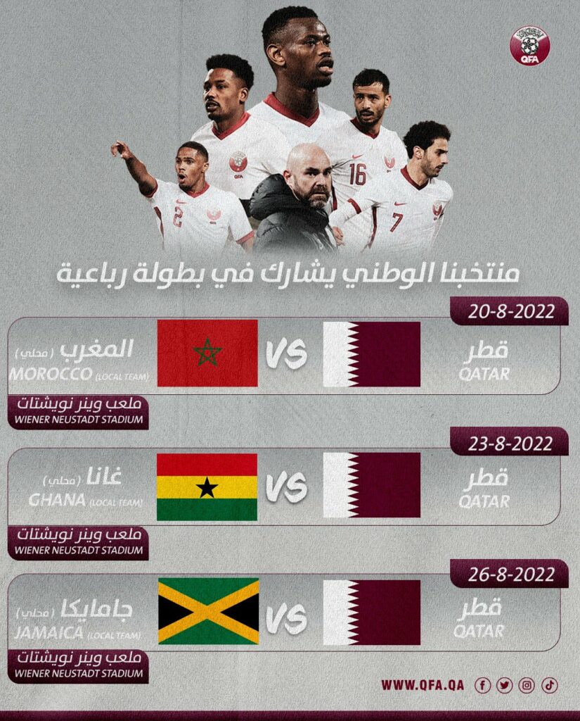 ويستهل العنابي مشوار البطولة 20 اغسطس بلقاء المنتخب المغربي، بينما تلتقي غانا مع جامايكا، وتشهد الجولة الثانية في 23 اغسطس لقاء منتخب قطر مع نظيره الغاني، بينما يلتقي المغرب مع جامايكا، أما الجولة الثالثة في 26 اغسطس فسوف يلتقي من خلالها منتخب قطر مع جامايكا، فيما يلاقي المغرب غانا.
