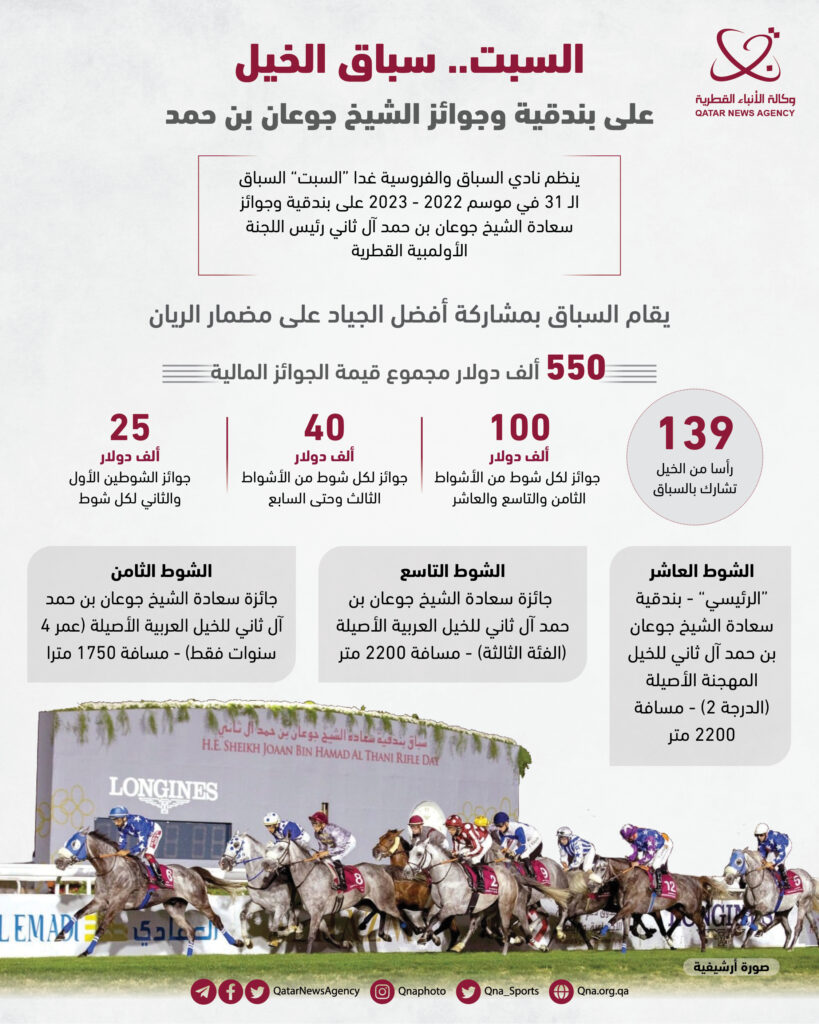 الدوحة: ينظم نادي السباق والفروسية غدا /السبت/ السباق الـ/31/ في موسم 2022 – 2023 على بندقية وجوائز سعادة الشيخ جوعان بن حمد آل ثاني رئيس اللجنة الأولمبية القطرية، والذي يقام بمشاركة أفضل الجياد على مضمار الريان بجوائز مالية تصل إلى 550 ألف دولار وبمشاركة 139 رأسا من الخيل.