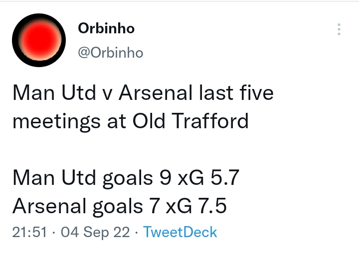 باستقراء هذه الأرقام، يتساءل معظم المشاهدين كيف لكل هذه اللمسات أن تترجم إلى هدف وحيد في لوحة النتيجة، والإجابة قد تبدو نظرية إلا أنها تحمل أوجه الحقيقة كاملةً. سوء اللمسة الأخيرة والقرار ما قبلها هو ما بدّد كل هذه الأرقام، ففي معظم اللقطات كان قرار التمرير أو التسديد من قبل حامل الكرة الأسوأ من حيث تحقيق الخطورة للفريق، وتلك معضلةٌ تتطلب حهدًا من طاقم الجهاز الفني لرفع جودة قرارات اللاعبين في الثلث الأخير، لا سيما وأن مباريات كهذه سيتم فيها معاقبتك من نصف فرصة، وسيضطر الفريق لدفع ضريبة مكلفة في النهاية بخسارة اللقاء، ولتأكيد ذلك يمكن إلقاء نظرة على مؤشر الأهداف المتوقعة للمباراة xG والذي تفوق فيه أرسنال نسبيا بواقع 1.52 هدف بينما سجل اليونايتد معدل 1.47 على الرغم من تسجيله لثلاثة أهداف، وهو ما يعكس حالة الارتباك الملازمة للفريق حينما يتعلق الأمر بالزيارات الخمس السابقة لأولدترافورد فمن إجمالي 5.7 هدف متوقع سجل اليونايتد 9 أهداف، في حين تطابق عدد أهداف أرسنال المسجلة والمتوقعة 7 من 7.5.