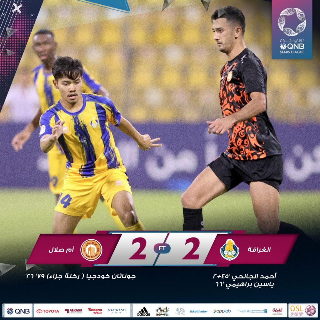 تعادل الغرافة وأم صلال بهدفين لكل منهما، في مباريات الأسبوع السادس من دوري نجوم QNB للموسم 2022-2023، والتي أقيمت الثلاثاء على استاد سحيم بن حمد بنادي قطر، ليتقاسم الفريقين نقاط المباراة.