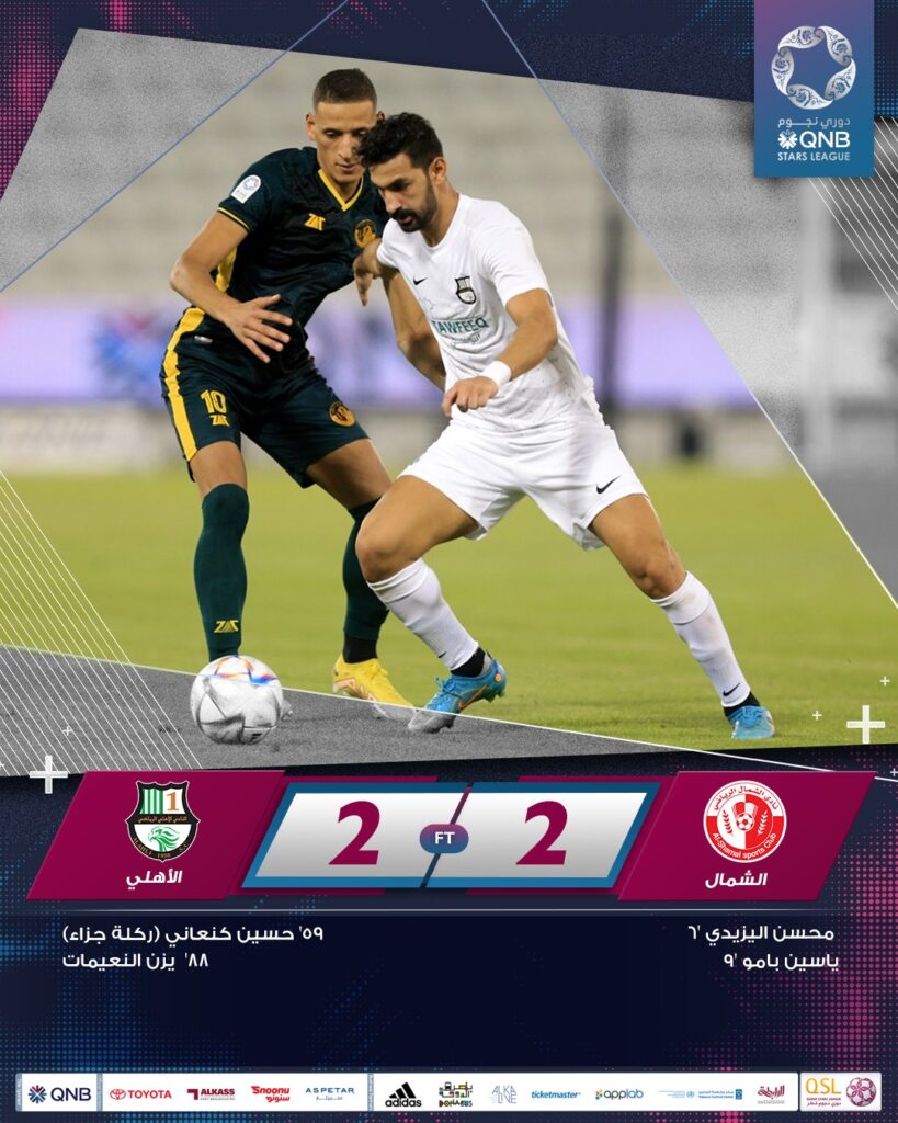 تعادل الشمال والأهلي بنتيجة 2-2 في المباراة التي جمعت الفريقين على استاد جاسم بن حمد بنادي السد ضمن منافسات الأسبوع السابع من دوري نجوم QNB .