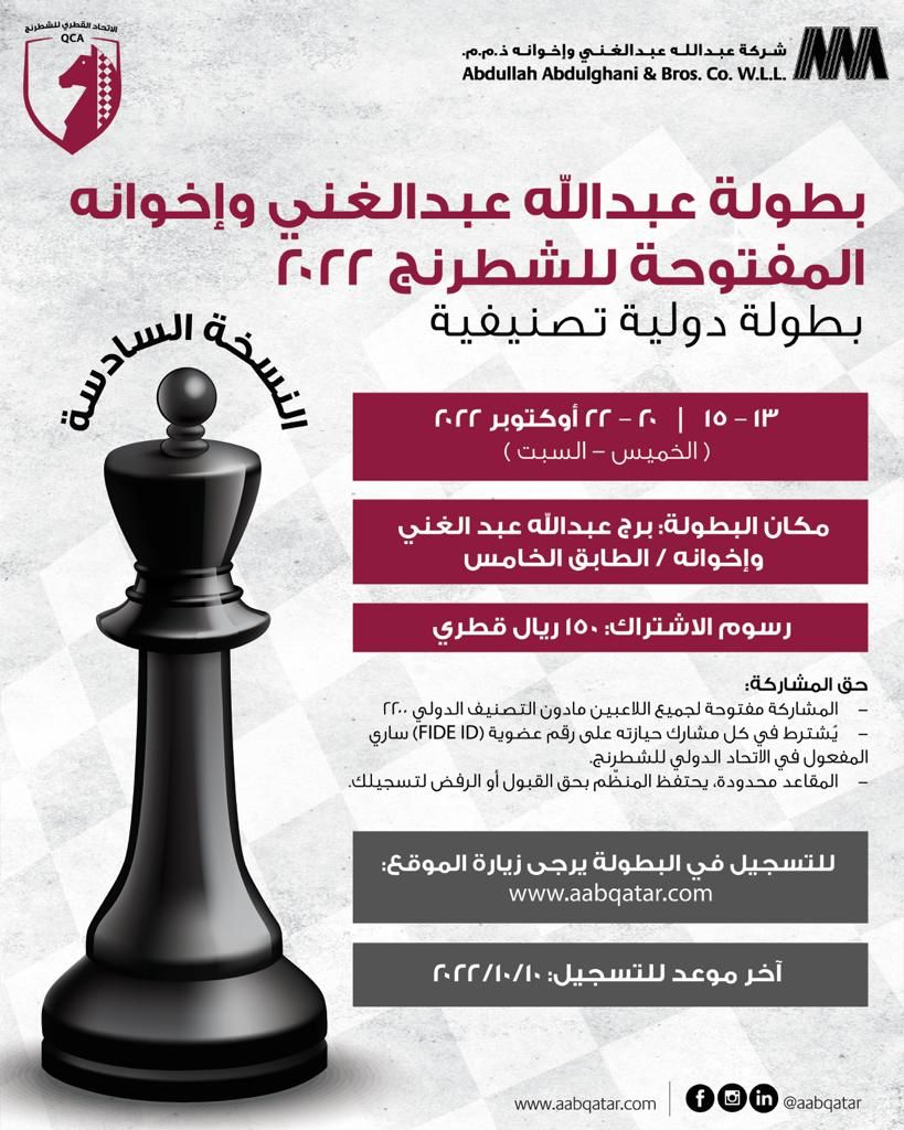 تنطلق النسخة السادسة من بطولة عبدالله عبدالغني وإخوانه المفتوحة للشطرنج في الفترة من 13 إلى 15 أكتوبر ومن 20 إلى 22 من الشهر نفسه في الطابق الخامس من برج عبدالله عبدالغني وإخوانه، وستقام البطولة بنظام الشطرنج الكلاسيكي من 9 جولات على مدار اسبوعين متتاليين لجميع اللاعبين الذين يقل تصنيفهم الدولي عن 2200 نقطة،والتسجيل مفتوح حتى 10 اكتوبر بمقاعد محدودة ويحتفظ الاتحاد القطري للشطرنج بالحق في قبول أو رفض التسجيل، ومن المتوقع أن تشهد البطولة منافسات قوية في ظل رغبة المشاركين لحصد الجوائز، على أن يتم تحديد البطل خلال الجولة الأخيرة من منافسات اليوم النهائي.