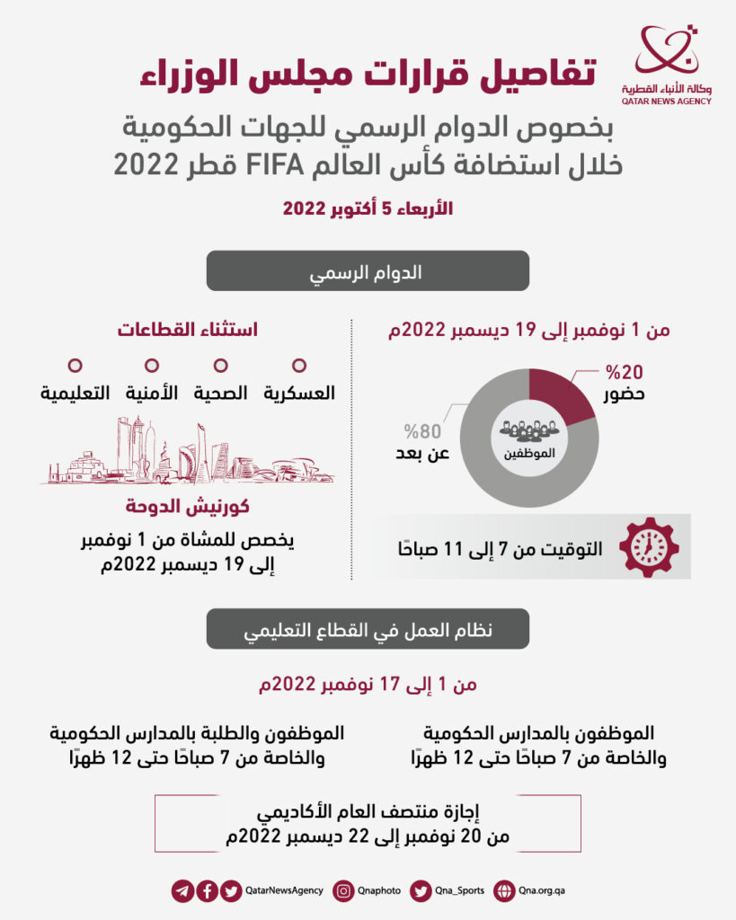 وقال الدكتور النويمي، إنه بناء على قرار مجلس الوزراء بتنظيم سير العمل في المؤسسات الحكومية المختلفة خلال فعاليات كأس العالم FIFA قطر 2022، فإنه سيتم، اعتبارا من يوم الثلاثاء الموافق للأول من نوفمبر المقبل وحتى يوم الإثنين الموافق 19 ديسمبر 2022 الآتي: أولا – الجهات الحكومية : – تقليص عدد الموظفين المتواجدين في مقرات العمل بالجهات الحكومية إلى 20 بالمائة من إجمالي عدد الموظفين لدى الجهة، بينما سيباشر 80 بالمائة أعمالهم عن بعد.