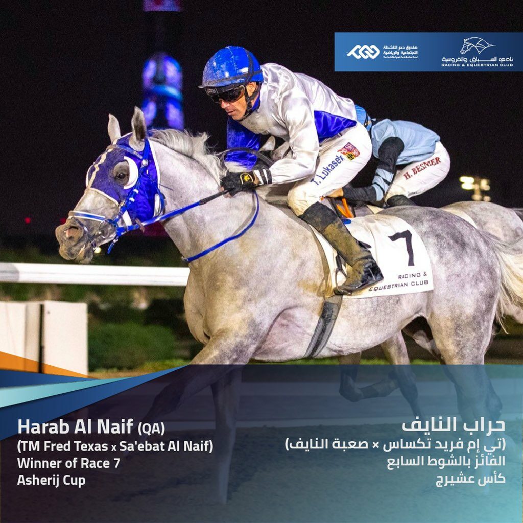 الدوحة : فازت الفرس /حراب النايف/، ملك يوسف عبد الله حسن اللنجاوي، بكأس /عشيرج/ للخيل العربية الأصيلة إنتاج محلي (الإناث فقط) – شوط مشروط، بعد أن حلت في المركز الأول في الشوط السابع (الرئيسي) في السباق الثالث لموسم 2022 – 2023 الذي نظمه نادي السباق والفروسية مساء اليوم على مضماره الرملي بالريان.