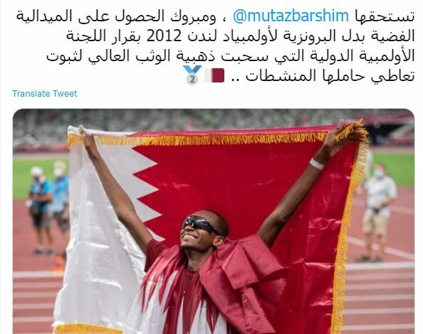 هنأ سعادة الشيخ جوعان بن حمد آل ثاني رئيس اللجنة الأولمبية بطلنا العالمي معتز برشم بحصوله على الميدالية الفضية بدلا عن البرونزية بقرار من اللجنة الاولمبية الدولية بعد ثبوت تعاطي حامل الميدالية الذهبية في أولمبياد لندن للمنشطات