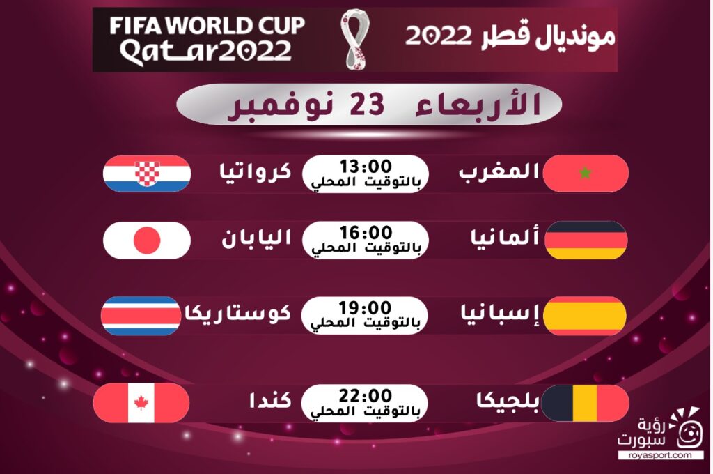 الدوحة : رؤيةسبورت– تشهد منافسات اليوم الأربعاء الثالث والعشرين من شهر فبراير 2022 ضمن منافسات مونديال قطر 2022 أربعة مباريات كالتالي: