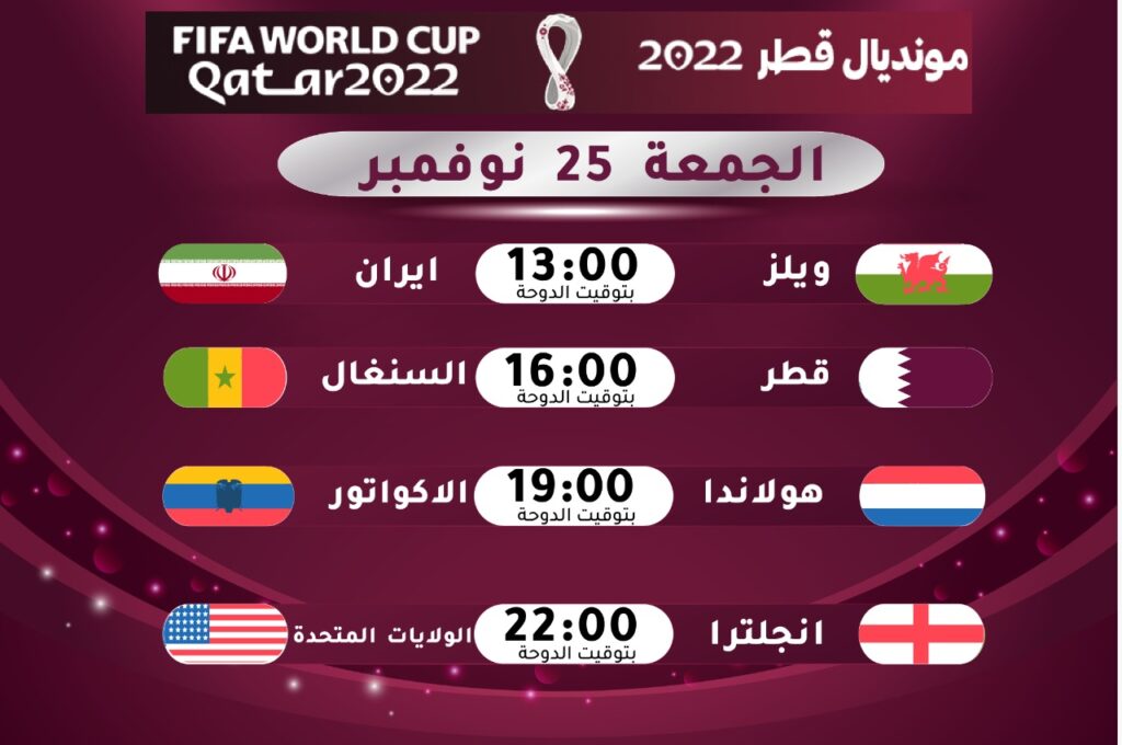 تقام اليوم الجمعة 26 نوفمبر ضمن منافسات بطولة كأس العالم قطر 2022 لكرة القدم أربعة مباريات كالتالي: