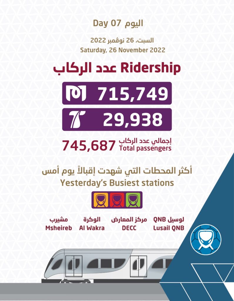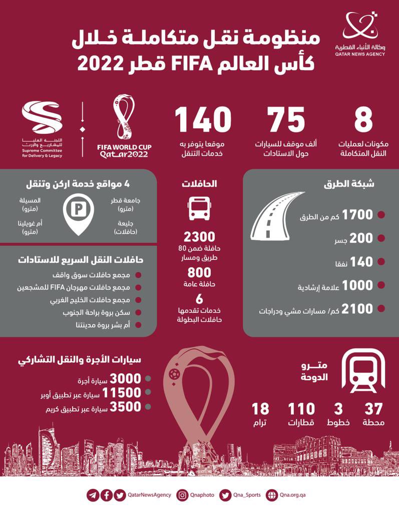 يشار إلى أن مشجعي كأس العالم FIFA قطر 2022، يعتمدون على الحافلات ومترو الدوحة وشبكة الترام الخفيف وسيارات الأجرة للتنقل في أنحاء قطر خلال أيام المباريات، وتشكل خطوط المترو الشريان الرئيسي لأنظمة النقل خلال البطولة العالمية، حيث تتصل خمسة من الاستادات المونديالية الثمانية مباشرة بمحطات المترو العصري، فيما يتصل باقي الاستادات بمجموعة من خدمات النقل، بما فيها محطات المترو وحافلات النقل السريع.