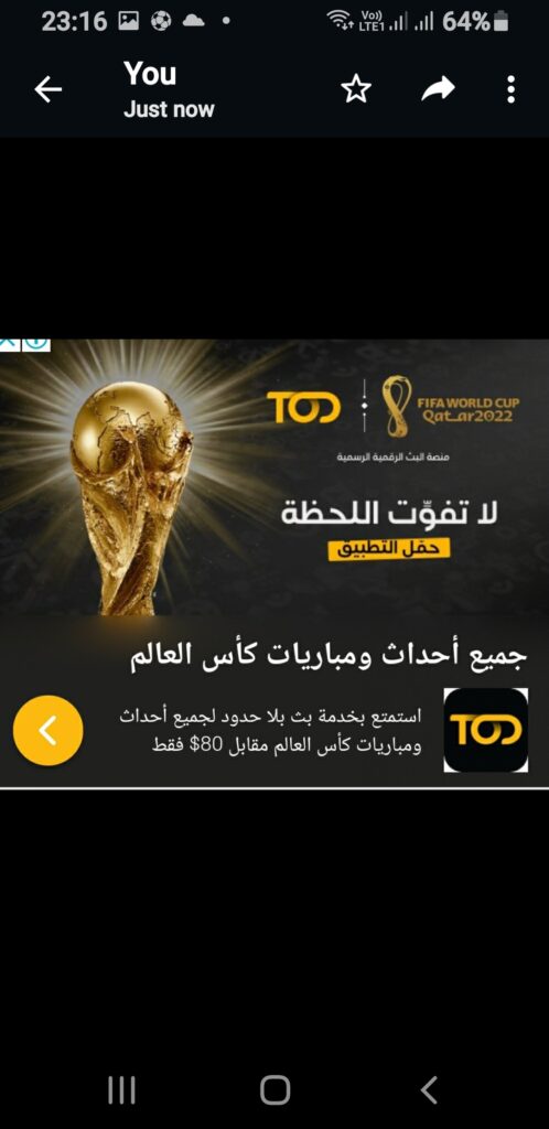 وتُعد TOD من أولى المنصات التي تقدم هذه الخدمة لمتابعي محتوى البث الرياضي في منطقة الشرق الأوسط وشمال أفريقيا، إلى جانب امتلاكها حقوق بث العديد من الفعاليات البارزة في المنطقة، بما فيها مباريات بطولة العالم لكرة القدم 2022 المقامة في قطر وكأس ديفيز ودوري أبطال أوروبا للسيدات ودوري بيج باش للكريكيت وسلسلة مباريات وان دي إنترناشيونال بين أستراليا وإنجلترا ومنافسات الفنون القتالية المختلطة وسباعيات دبي للرجبي وغيرها الكثير من البطولات المرتقبة.