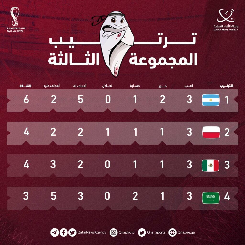 وأصبح الأخضر السعودي هو ثالث منتخب عربي يخرج من الدور الأول للبطولة بعد منتخبي قطر وتونس بعد أن تجمّد رصيد المنتخب السعودي عند النقاط الثلاث، متراجعاً إلى المركز الأخير في المجموعة، في حين لم تكف النتيجة المنتخب المكسيكي لحجز مقعده في الدور ثمن النهائي من البطولة، رغم وصوله إلى النقطة الرابعة متساوياً مع المنتخب البولندي المتأهل ثانياً، بعدما تأخر بفارق الأهداف في المجموعة التي تأهل عنها المنتخب الأرجنتيني بطلاً بعد فوزه على بولندا بهدفين دون رد في المباراة التي جرت في التوقيت ذاته.