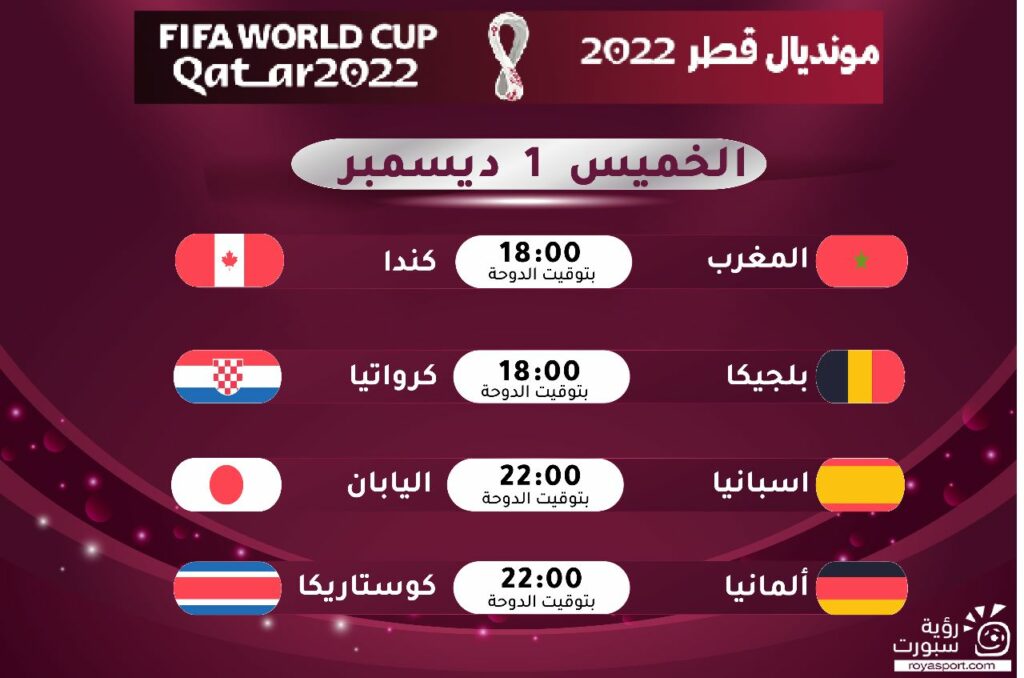 الدوحة : رؤيةسبورت– تقام اليوم ضمن منافسات المجموعة الرابعة لبطولة كأس العالم قطر 2022 أربعة مباريات وتقام المباراتان بالتزامن كالتالي:
