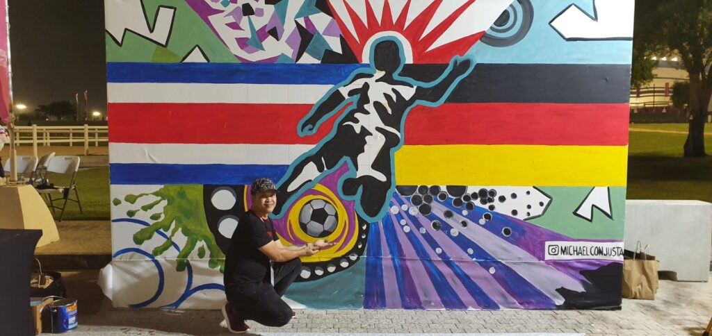 ويشارك فنان الجرافيتي مايكل كونجوستا، الذي يقيم في قطر منذ العام 1998، في البرنامج من خلال رسم اللوحات الجدارية الملونة، بحضور المشجعين في العديد من مواقع البطولة، ونجح في إبهار الجمهور بلوحاته الرائعة في استادات البيت ولوسيل والجنوب والثمامة، إضافة إلى كورنيش الدوحة.