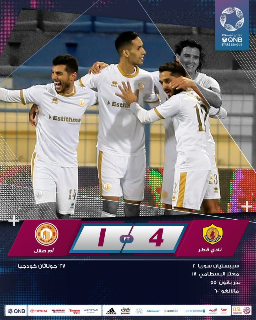 سجل أهداف نادي قطر: سيبستيان سوريا ومعتز البسطامي وبدر بانون ومالانجو في الدقائق 2 و18 و55 و60، وسجل كودجيا الهدف الوحيد لأم صلال في الدقيقة 27.