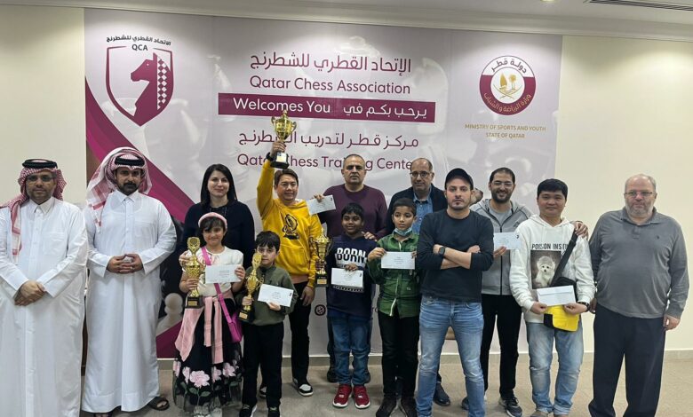 اختتمت البطولة المصنفة للشطرنج الخاطف المفتوحة التي نظمها مركز قطر لتدريب الشطرنج تحت إشراف الاتحاد القطري للعبة بمشاركة كبيرة وواسعة بلغ عددها 94 لاعباً ولاعبة والتي اقيمت منافستها بطريقة الشطرنج الخاطف وفق النظام السويسري من 9 جولات 3 دقائق + ثانيتين لكل نقلة،وذلك بحضور محمد المضاحكة رئيس الاتحاد القطري للشطرنج.