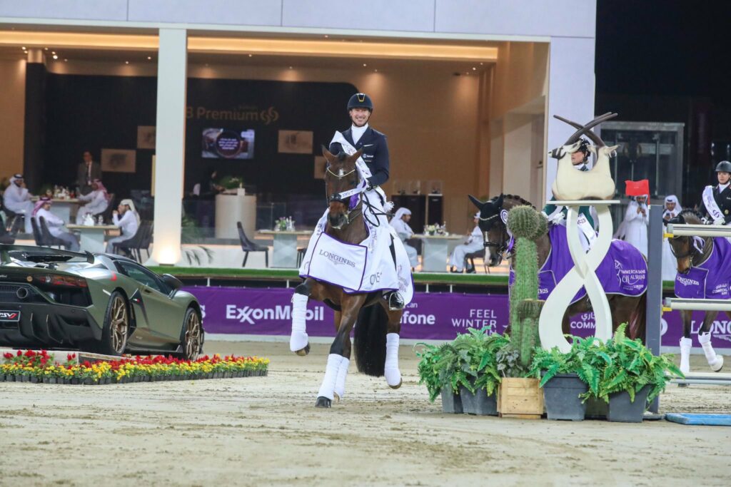 الدوحة: توج الألماني ماركوس اينينج بلقب الجائزة الكبرى التي اقيمت مساء السبت في ختام النسخة العاشرة من بطولة البنك التجاري الدولية للفروسية – الشقب برعاية لونجين، الحدث السنوي الأبرز بالمنطقة، والتي اختتمت منافساتها اليوم في ميدان لونجين ونظمها الشقب لمدة ثلاثة أيام متتالية.