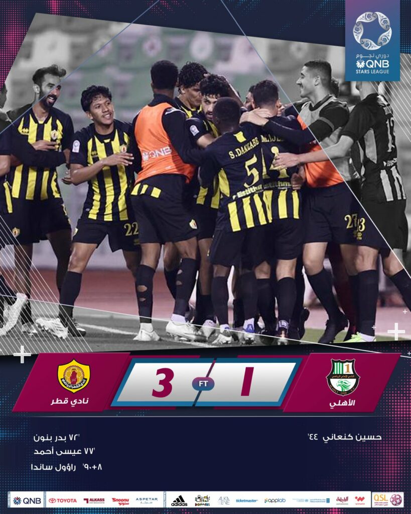 ورفع نادي قطر رصيده إلى 26 نقطة، وتوقف رصيد الأهلي عند 21 نقطة.