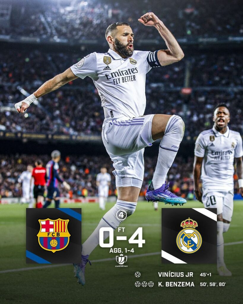 ولم يجد ريال مدريد صعوبة في التفوق على برشلونة بملعب /كامب نو/ وتمكن من إنهاء الشوط الأول بهدف دون رد، فتح به الطريق لثلاثة أهداف في الشوط الثاني بعد أن فرض على برشلونة الخروج من مناطقه من أجل التعادل، لينجح كريم بنزيما من تسجيل اسمه كأحد أبرز هدافي ريال مدريد في مواجهات الفريقين بعد أن ساهم في (8) أهداف (سجل 6 وصنع 2) في آخر (6) مباريات بين الفريقين في جميع المسابقات.
