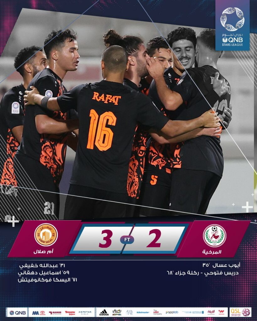 وبهذا الفوز وصل رصيد أم صلال إلى 16 نقطة في المركز قبل الأخير، بينما توقف رصيد المرخية عند 18 نقطة في المركز الثامن.