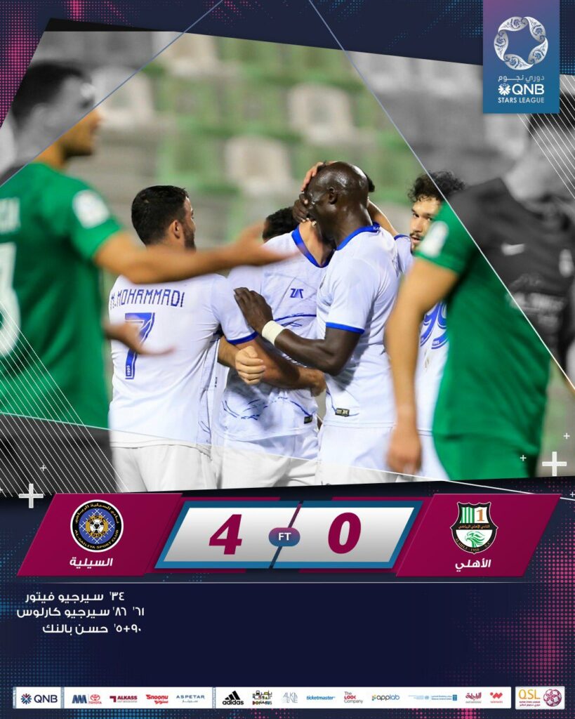 الدوحة : رؤية سبورت– حقق السيلية فوزاً ثميناً على الأهلي بأربعة أهداف دون رد، في المباراة التي جمعت بين الفريقين على استاد حمد بن خليفة بالنادي الأهلي، ضمن مباريات الأسبوع العشرين من منافسات دوري نجوم QNB للموسم 2022-2023، وذلك مساء اليوم السبت.