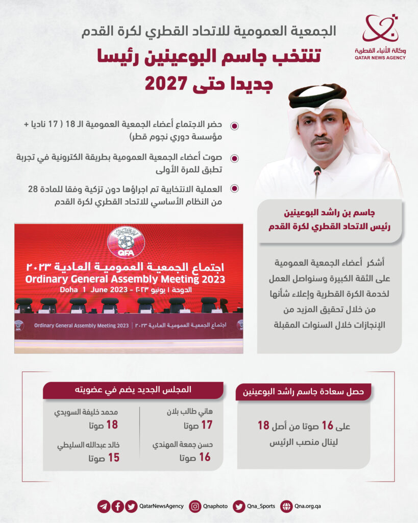 الدوحة: انتخبت الجمعية العمومية للاتحاد القطري لكرة القدم سعادة السيد جاسم بن راشد البوعينين، رئيسا جديدا للاتحاد خلال الدورة المقبلة الممتدة من العام الجاري 2023 حتى 2027 .