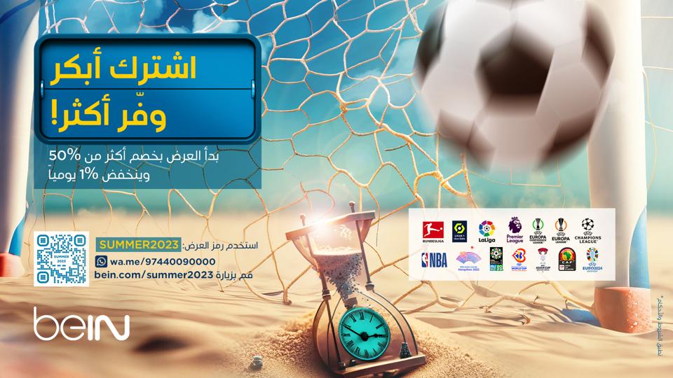 ويسري عرض الصيف من beIN من الخميس 8 يونيو ولغاية الإثنين 31 يوليو، بخصم يبدأ من 54% على جميع باقات المجموعة. وتدعو مجموعة beIN الإعلامية الجميع للإسراع بالاشتراك والاستفادة من أكبر قدر من الخصومات، لا سيما وأنّ الخصم ينخفض يومياً بنسبة 1% عند منتصف الليل بتوقيت مكة المكرمة.