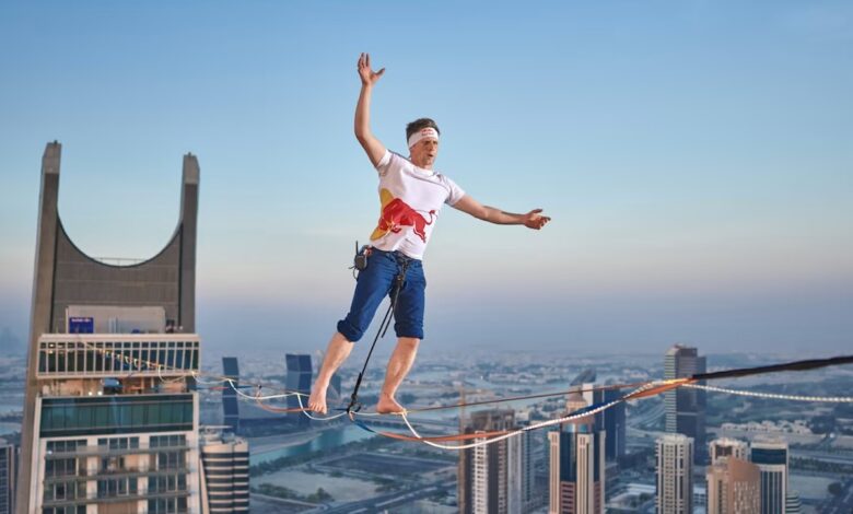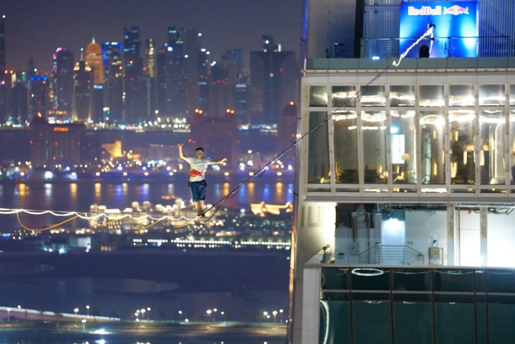 مغامر عالمي يحقق رقما قياسيا جديدا في قطر للمشي على أطول حبل مضيء بالعالم