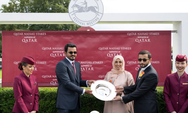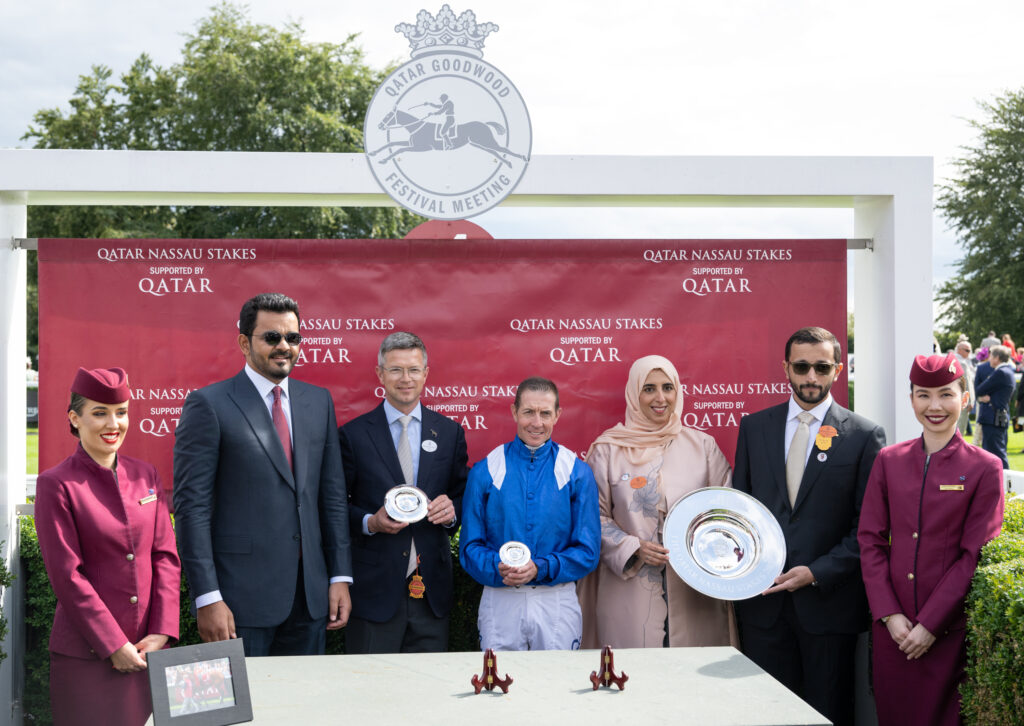لندن: توج سعادة الشيخ جوعان بن حمد آل ثاني رئيس اللجنة الأولمبية القطرية، اليوم الفائزين في شوط قطر ناسو ستيكس من الفئة الأولى للخيل المهجنة الأصيلة الذي أقيم ضمن أشواط ثالث أيام مهرجان /قطر غودوود/ على مضمار غودوود بالمملكة المتحدة برعاية نادي السباق والفروسية.