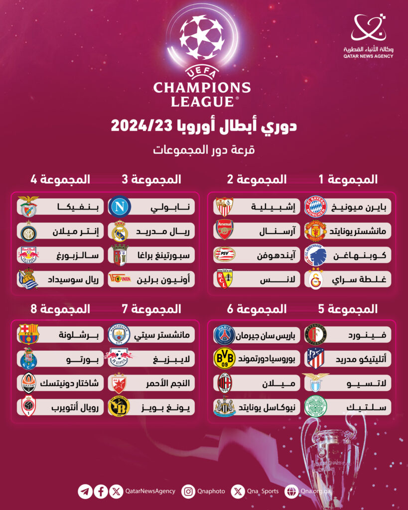 موناكو : سفرت قرعة مرحلة مجموعات دوري أبطال أوروبا للموسم الحالي 2023 – 2024، والتى سحبت مساء اليوم الخميس، فى إمارة موناكو الفرنسية، عن مجموعات متوازنة، ما عدا المجموعة السادسة، والتى يطلق عليها لقب مجموعة الموت.