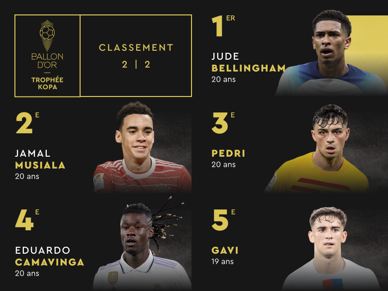 وأحرز النجم الإنجليزي الشاب جود بيلينجهام هداف ريال مدريد الإسباني جائزة كوبا لأفضل لاعب شاب متفوقا على ثلاثي برشلونة جافي وبيدري وأليخاندرو فالدي، وكذلك على زميله إدواردو كامافينجا وأيضا تفوق على راسموس هويلوند مهاجم مانشستر يونايتد، وجمال موسيالا لاعب بايرن ميونيخ.