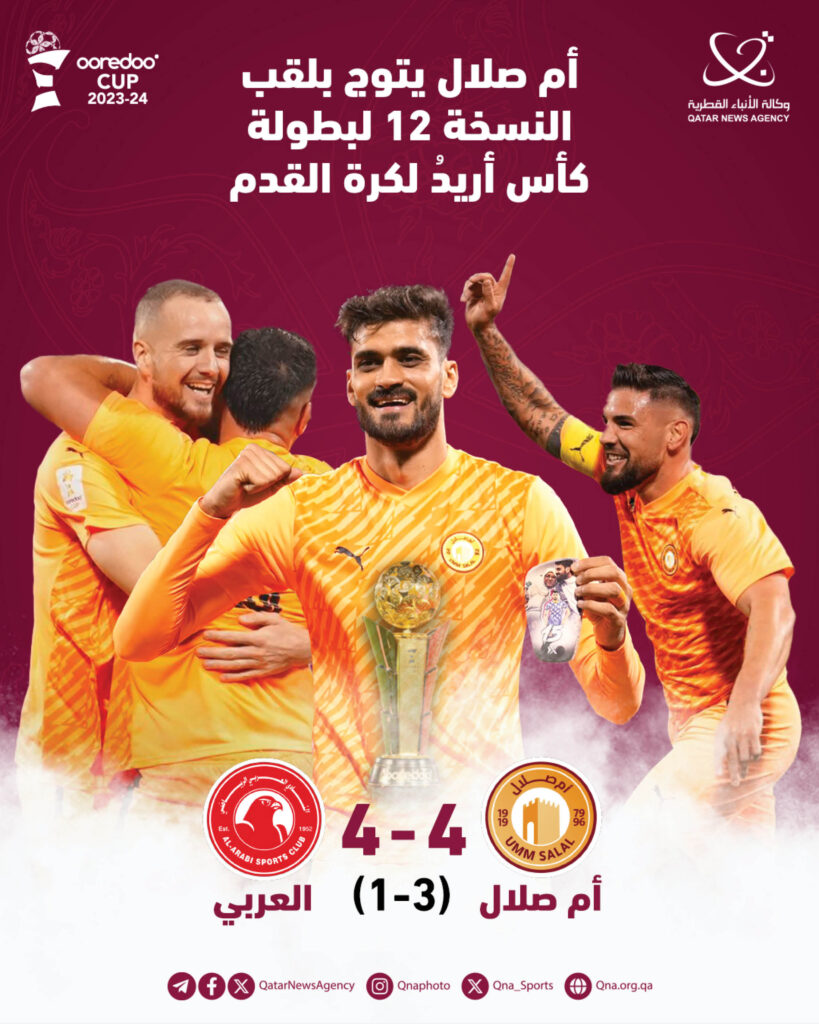 الدوحة: توج فريق أم صلال بلقب النسخة 12 من بطولة كأس “أريدُ” لكرة القدم للموسم 2023 / 2024 وذلك عقب تغلبه على العربي بركلات الترجيح 3/ 1 بعد تعادلهما بأربعة أهداف لكل منهما في الوقت الأصلي من المباراة النهائية التي جرت اليوم على استاد حمد الكبير.