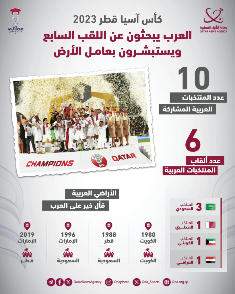 الدوحة: تتطلع المنتخبات العربية المشاركة في النسخة الثامنة عشرة من كأس آسيا لكرة القدم التي تستضيفها الدوحة في الفترة ما بين الثاني عشر من يناير وحتى العاشر من فبراير المقبل، إلى أن تبقي اللقب القاري في حوزتها لنسخة جديدة.