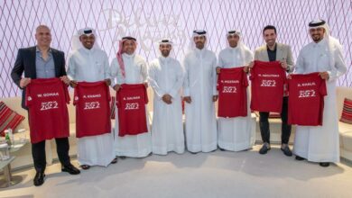 وفي الوسط: أحمد فتحي وجاسم جابر (العربي)، وعبد العزيز حاتم (الريان)، وحسن الهيدوس وعلي أسد ومحمد وعد ومصطفى مشعل (السد)، وخالد محمد (الدحيل).