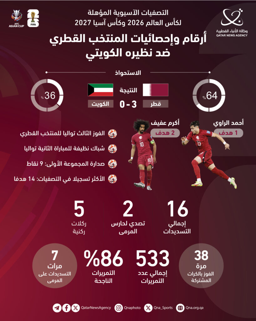 وحقق المنتخب القطري فوزه الثالث تواليا في التصفيات، رافعا رصيده إلى النقطة التاسعة في صدارة المجموعة الأولى، في حين تجمد رصيد المنتخب الكويتي عند ثلاث نقاط في المركز الثالث.