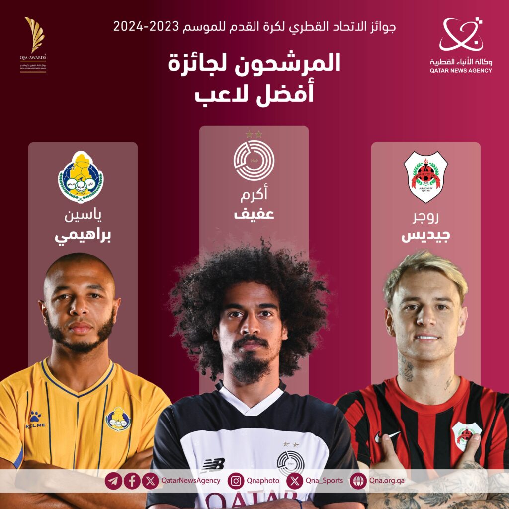 وأعلن الاتحاد، اليوم، أن قائمة المرشحين لجائزة أفضل لاعب تضم كلا من: أكرم عفيف (مهاجم السد)، والجزائري ياسين براهيمي (لاعب الغرافة) والبرازيلي روجر غيديش (مهاجم الريان)، فيما سيتنافس على جائزة أفضل مدرب كل من القطري وسام رزق (مدرب السد بطل الدوري)، والبرتغالي ليوناردو جارديم (مدرب الريان وصيف الدوري)، والبرتغالي بيدرو مارتينيز (مدرب الغرافة ثالث الترتيب)، بينما تم ترشيح جاسم جابر (مدافع العربي)، ومصطفى طارق مشعل (لاعب السد)، ومهدي سالم (لاعب الشمال) لجائزة لأفضل لاعب تحت 23 عاما.