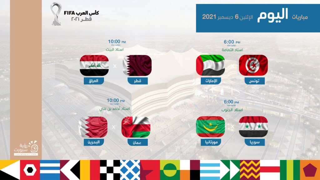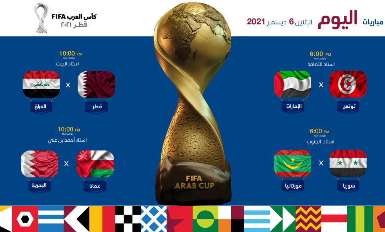 تجرى اليوم 4 مباريات قوية ومثيرة ضمن إطار المجموعتين الأولى والثانية لبلوغ الدور ربع النهائي في بطولة كأس العرب العاشرة التي تحتضنها ستة ملاعب مونديالية مخصصة لاستضافة مونديال قطر 2022
