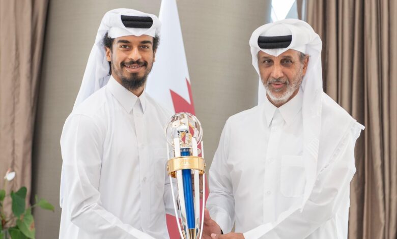 الدوحة: كرم سعادة الشيخ حمد بن خليفة بن أحمد آل ثاني وزير الرياضة والشباب، أكرم عفيف لاعب المنتخب القطري لكرة القدم ونادي السد، الحائز على جائزة أفضل لاعب في آسيا 2023.