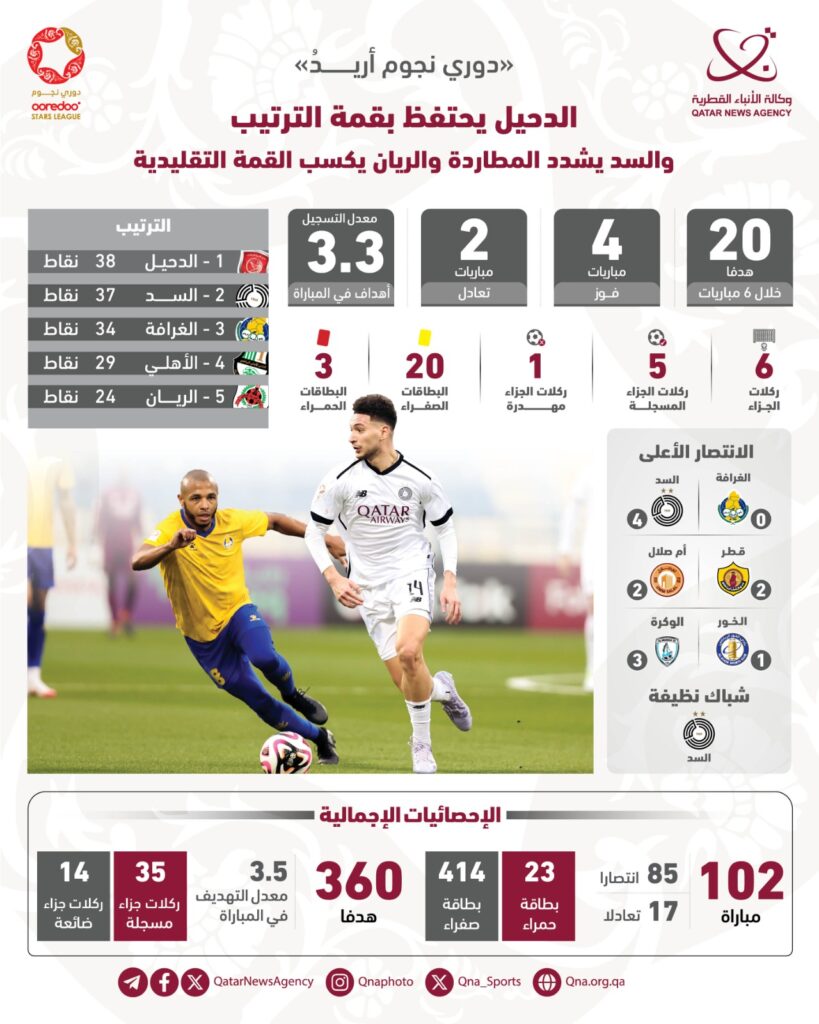 وبهذا الانتصار، بقي الدحيل متربعا على القمة بعد أن رفع رصيده إلى 38 نقطة، محافظا على فارق نقطة واحدة فقط أمام أقرب ملاحقيه السد ليستمر الصراع على اللقب بينهما قبل خمس جولات من نهاية الدوري.
