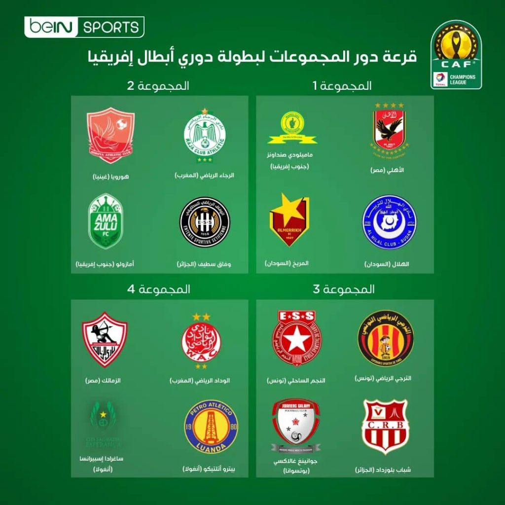 اجريت ظهر امس قرعة دوري ابطال افريقيا في مرحلة دور المجموعات وجاءت نتائجها كالتالي :
