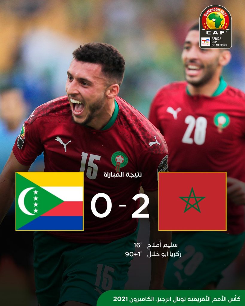حصد منتخب المغرب فوزه الثاني على التوالي في كأس أمم أفريقيا، بعد تغلبه على نظيره جزر القمر بهدفين دون رد، ضمن الجولة الثانية من المجموعة الثالثة في المباراة التي جمعت الفريقين مساء اليوم الجمعة ضمن منافسات كأس الأمم الأفريقية بالكاميرون.
